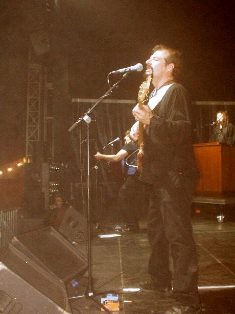 Photo by Pete Kines "Shotgun! Shoot 'em for he run now..." Vanilla Fudge on stage at Randers Music Week, Randers, Denmark, August 17, 2002. Note Pete straddling collapsing flloor panel in stage! Pete, don't "JUMP", this is not the place for a David Lee Roth! :-) In background, Vince Martell (left), Bill Pascali (right) |